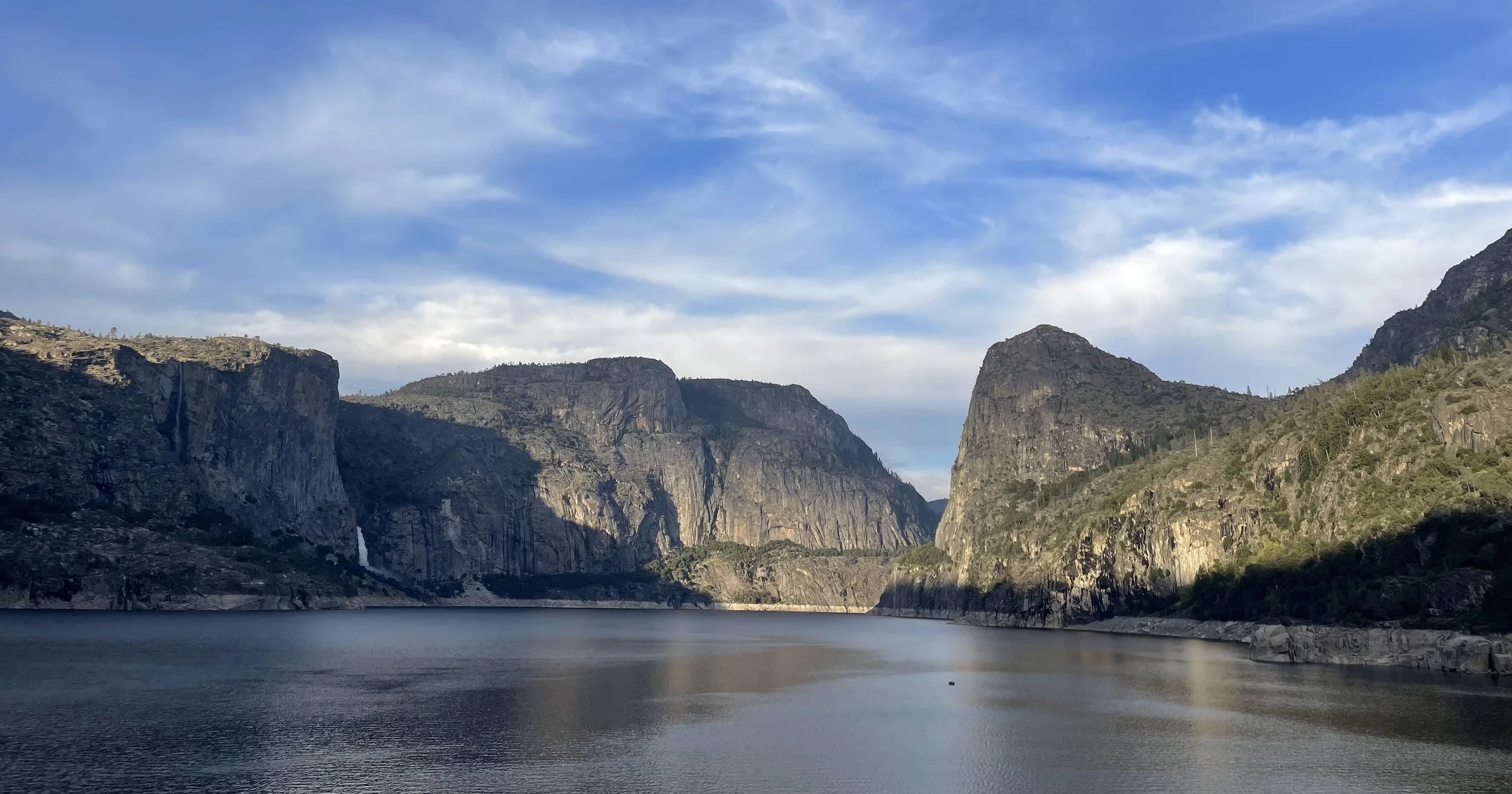 After an early breakfast and packing up camp we start our trek by crossing the impressive O'Shaughnessy Dam and following the trail along the cliffs above Hetch Hetchy Reservoir. Soon we reach the first of many waterfalls—Tueeulala Falls—before continuing to the thunderous cascade of Wapama Falls. During spring and early summer the falls are often roaring, sending cool mist across the bridge as we cross.